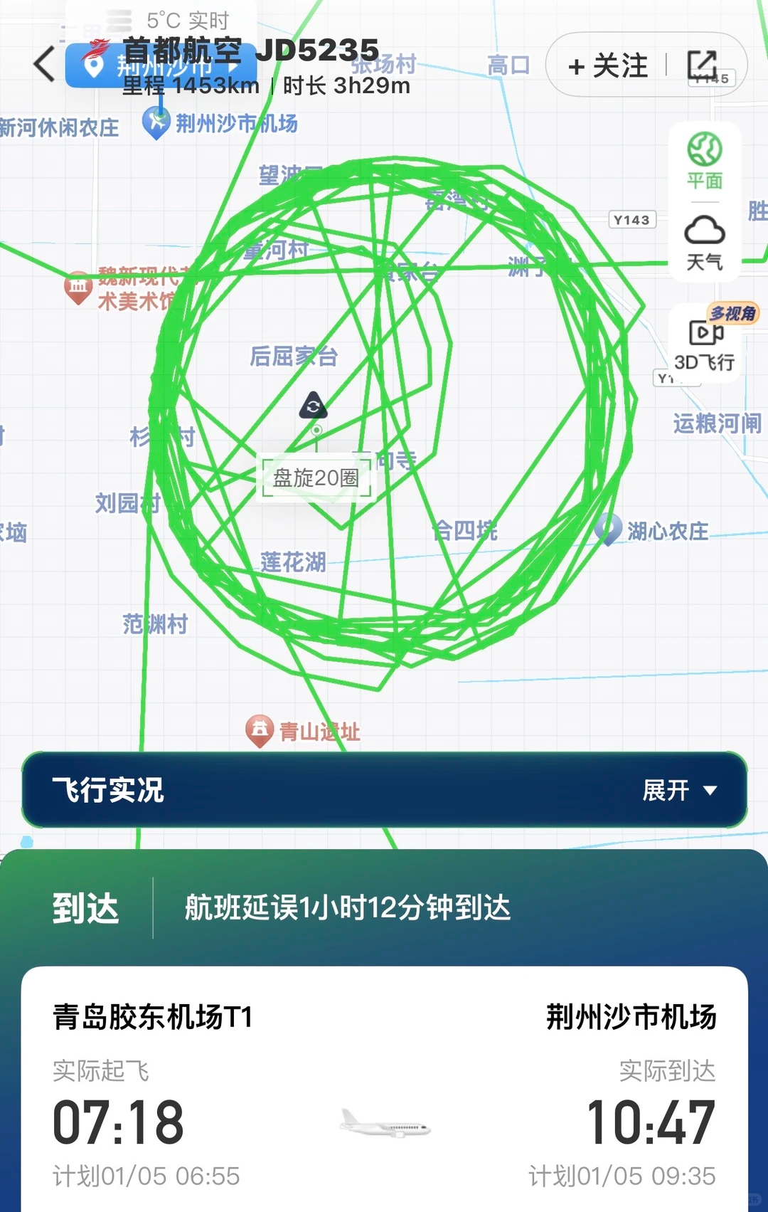 据了解,事发航班为1月5日青岛飞南宁的JD5235航班。飞常准平台显示,该航班在湖北荆州上空开始盘旋,开启“绕毛线”模式。记者粗略数了一下,飞机转了接近20圈。对此,首都航空工作人员解释道,当天JD5235航班从青岛起飞,中途经停荆州,最终飞抵南宁。当天在经停荆州时,恰逢荆州沙市机场大雾,飞机不具备降落条件,所以在空中盘旋了很多圈。